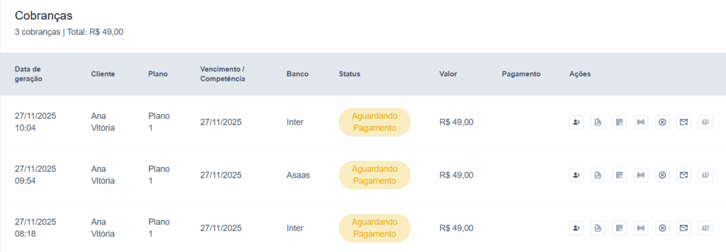 São disponibilizados ao usuário atalhos para copiar códigos, visualizar o cliente, abrir o PDF da fatura e mais.