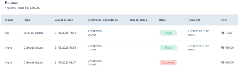 • Cancelado — faturas que foram canceladas, por exemplo, com plano cancelado.